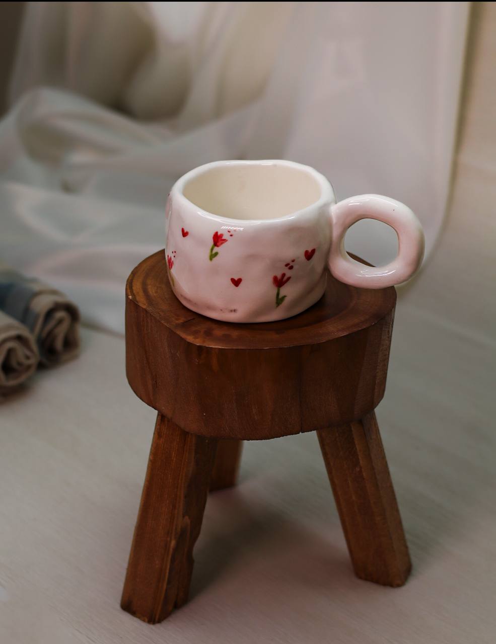 این فنجان اسپرسو سرامیکی با طراحی کاملاً دستساز، ظاهری متفاوت، گرم و هنری دارد. فرم خَمیدهی فنجان، شخصیت ویژهای به آن داده و هر قطعه را به یک اثر هنری منحصربهفرد تبدیل کرده است.